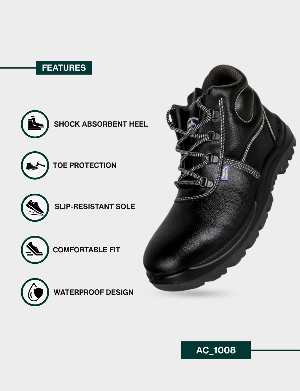 Allen Cooper 1008 safety shoes feature a 200 Joule steel toe cap, high-quality leather construction, and a slip-resistant PU double-density sole, providing excellent protection and comfort for demanding work environments​