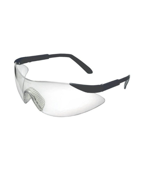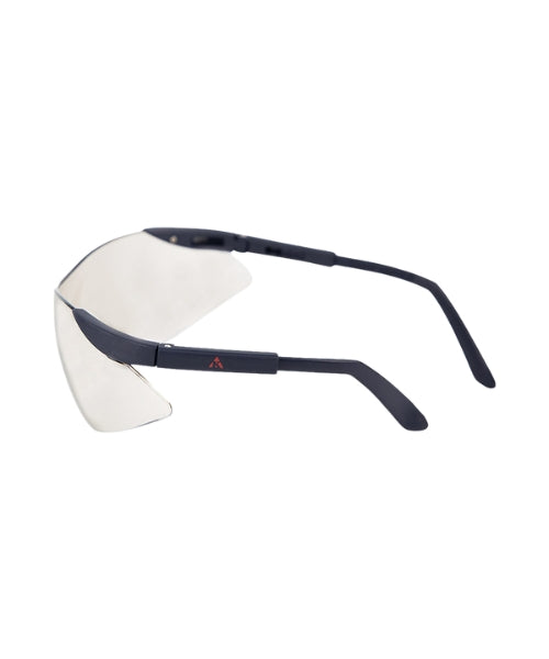 Executive-style protective spectacles with adjustable temples, clear lenses, and ergonomic design for professional safety.