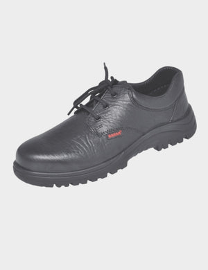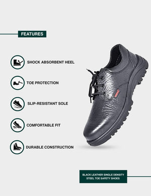 Black leather safety shoes with steel toe cap and single density sole, designed for reliable industrial foot protection.