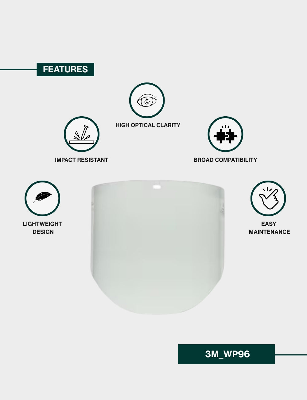 Lightweight polycarbonate visor providing face protection against impact and debris. Designed for compatibility with 3M headgear. Certified to ANSI Z87.1.