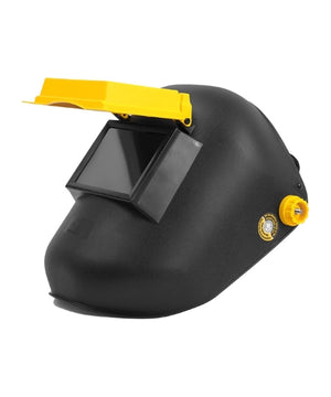 Flip-up window welding face shield with ratchet adjustment, offering protection against sparks, UV, and infrared radiation.