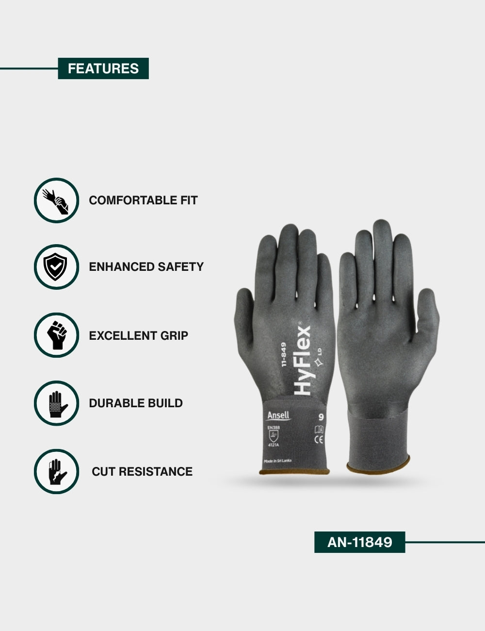 The Ansell HyFlex® 11-849 industrial gloves provide comprehensive protection and comfort for a variety of light-duty tasks.