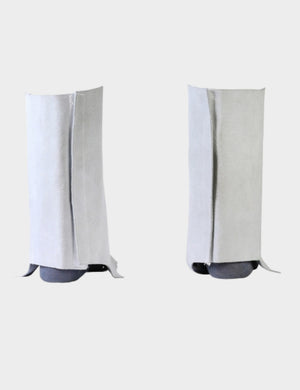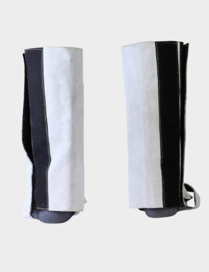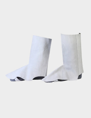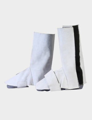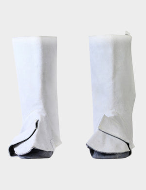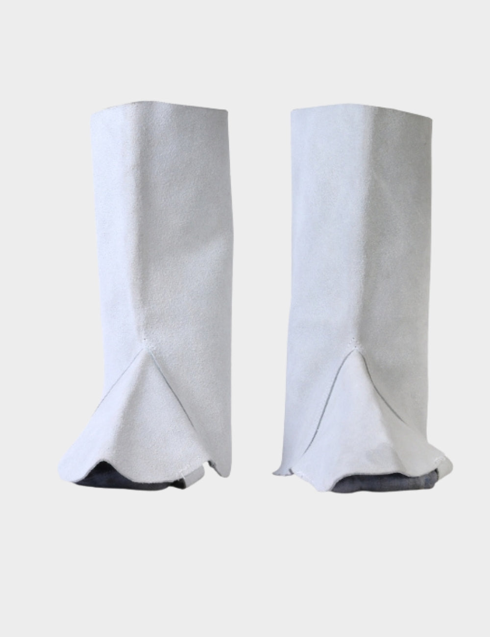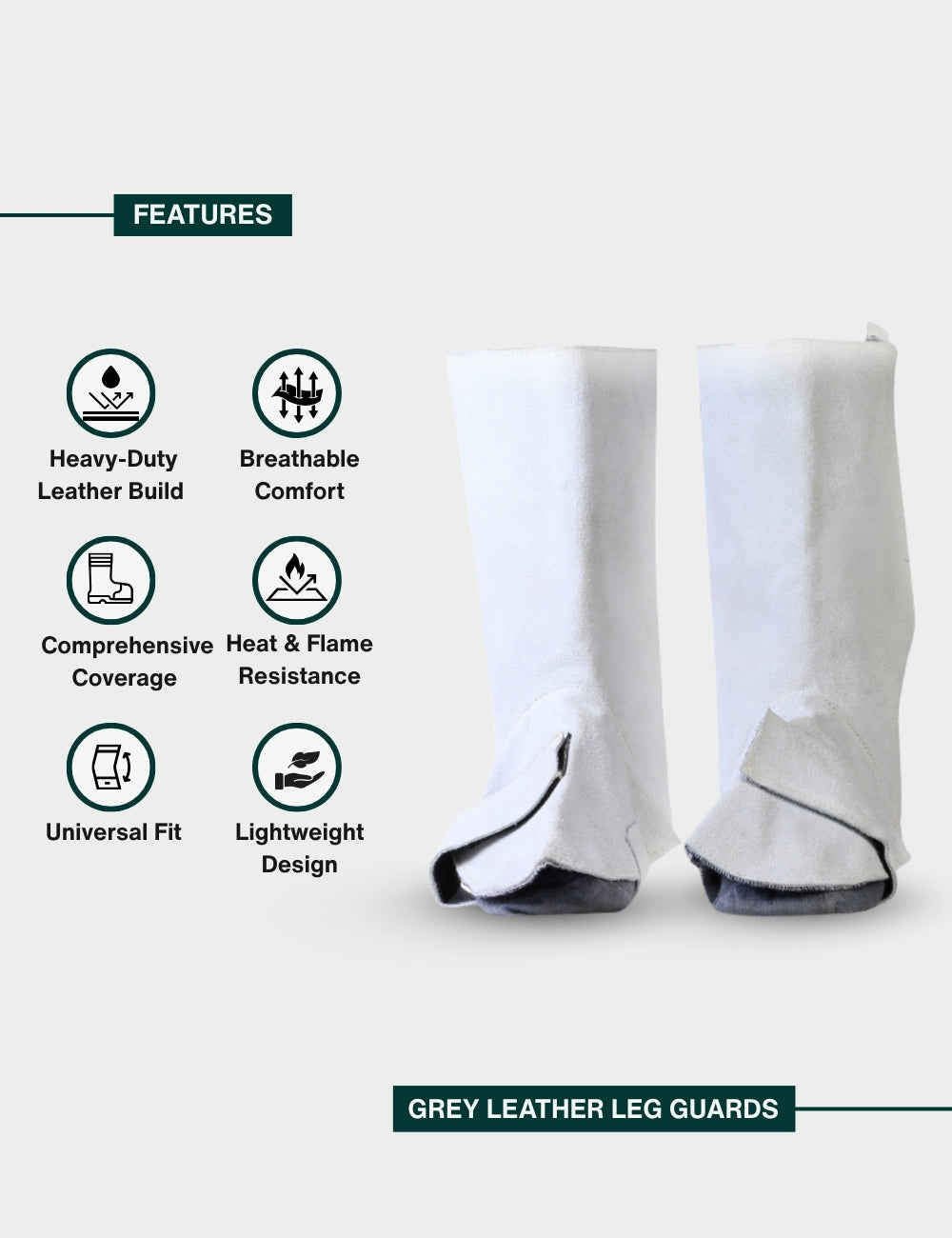 Heavy-duty grey leather leg guards with abrasion and heat resistance for welding, foundry, and industrial safety.