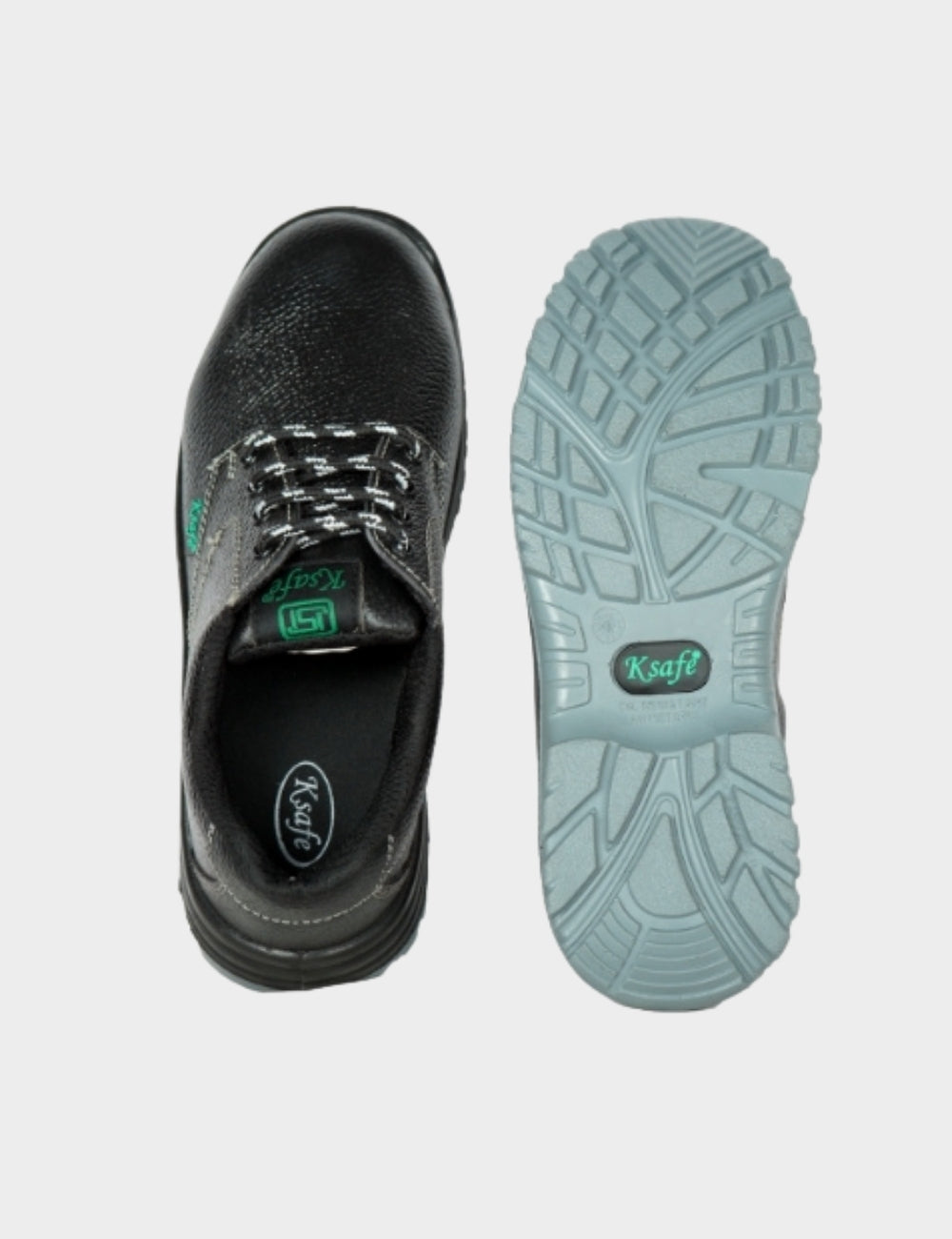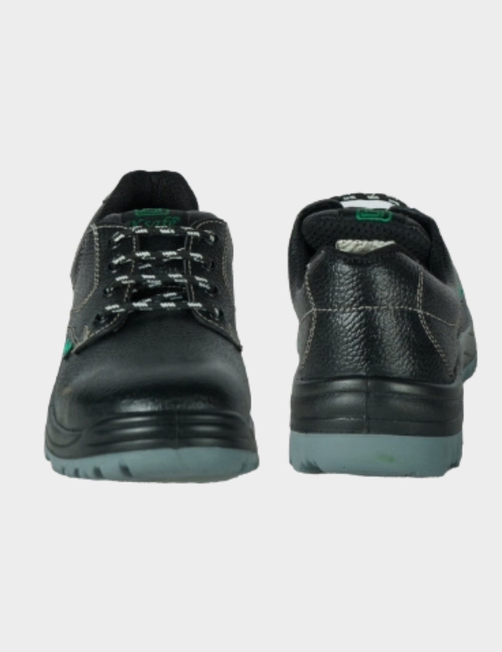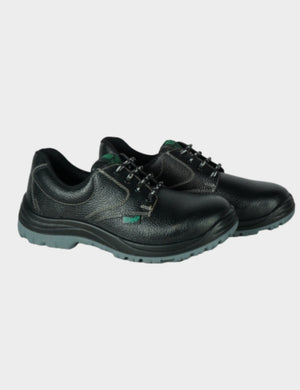 Heavy-duty black leather safety shoes with steel toe cap, oil- and slip-resistant sole, and rugged durability for industry.