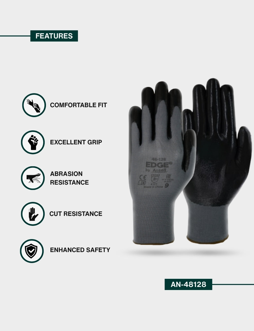 The Ansell HyFlex® 48-128 industrial gloves provide superior grip and dexterity for a variety of light-duty tasks.