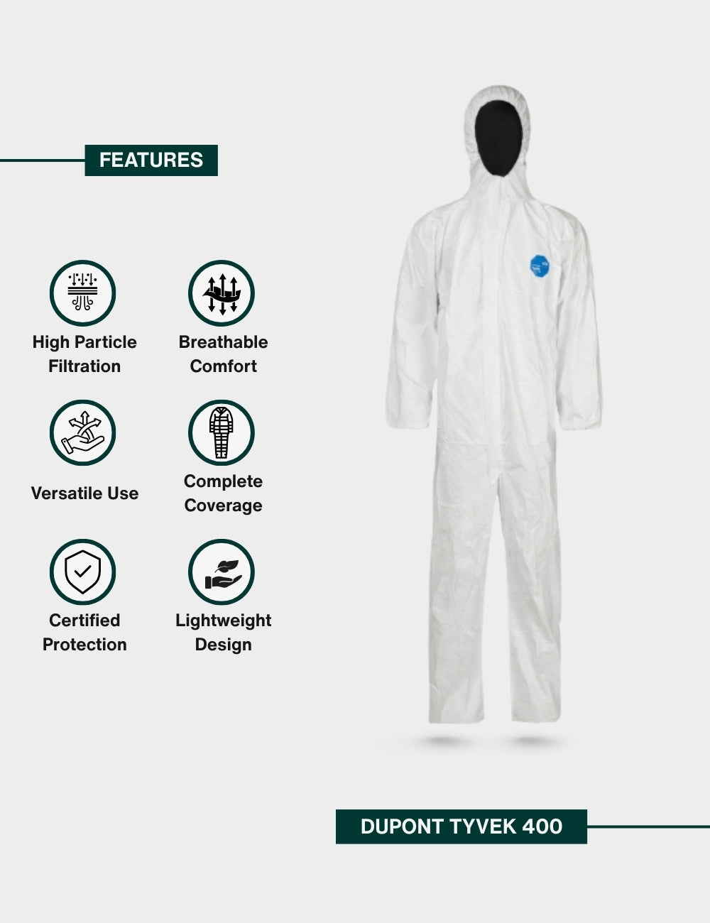 Lightweight, durable coveralls offering superior protection against hazardous particles, with enhanced comfort and mobility.