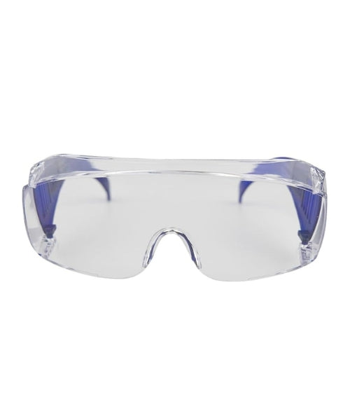 Clear protective spectacles designed to fit over prescription glasses, ensuring safety without compromising vision.