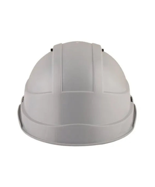 Peakless vented safety helmet with Polypropylene co-polymer shell and slider adjustment, designed for comfort, airflow, and industrial head protection.
