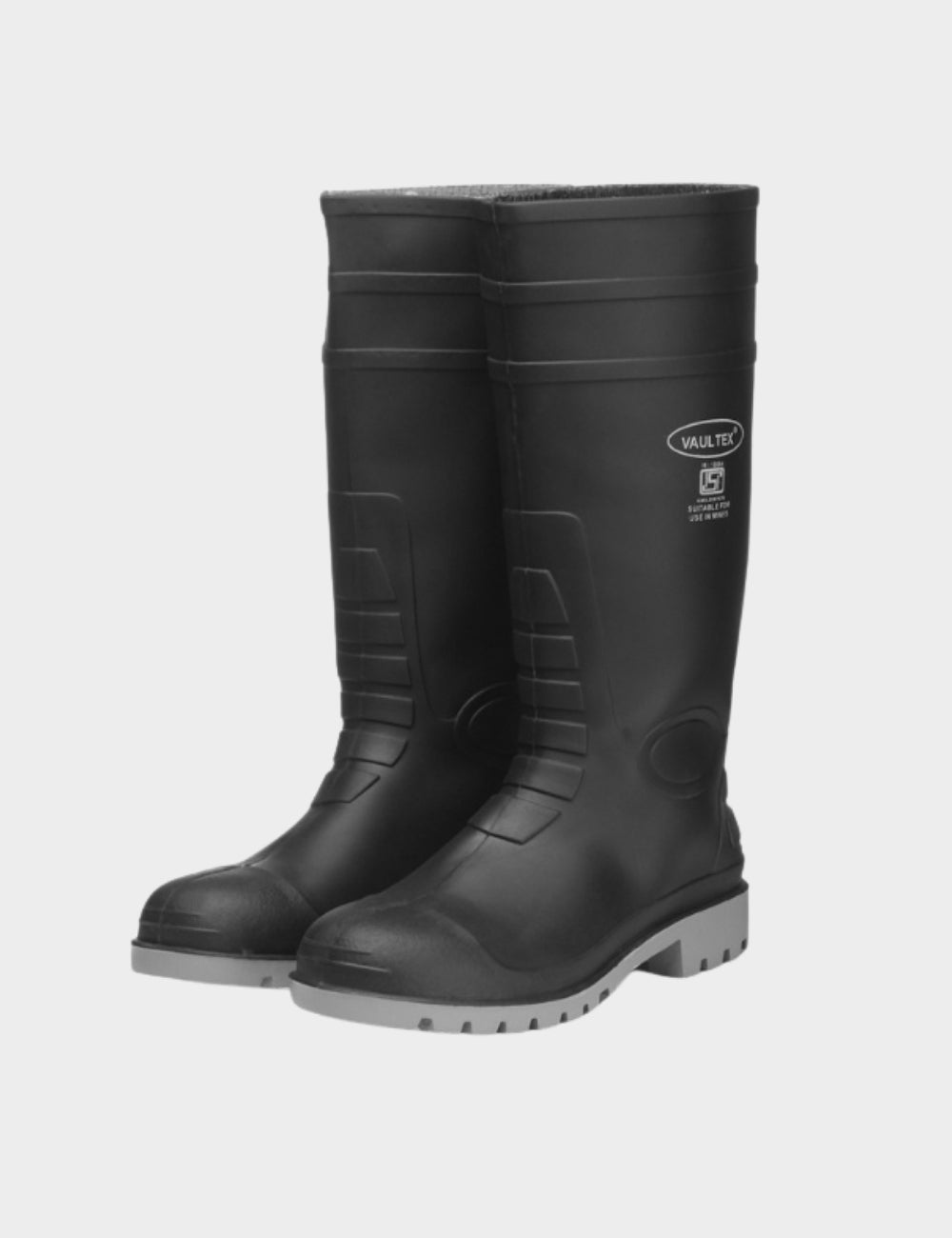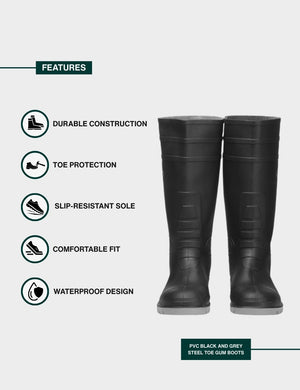 Heavy-duty PVC gumboots in black and grey with steel toe protection, oil- and acid-resistant sole for industrial safety.