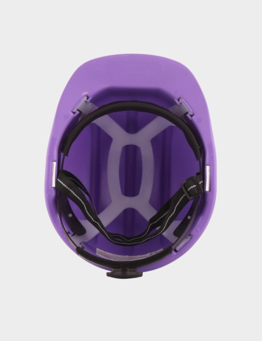 Unvented safety helmet with polypropylene co-polymer shell and ratchet adjustment, ensuring durability and secure fit for industrial safety.